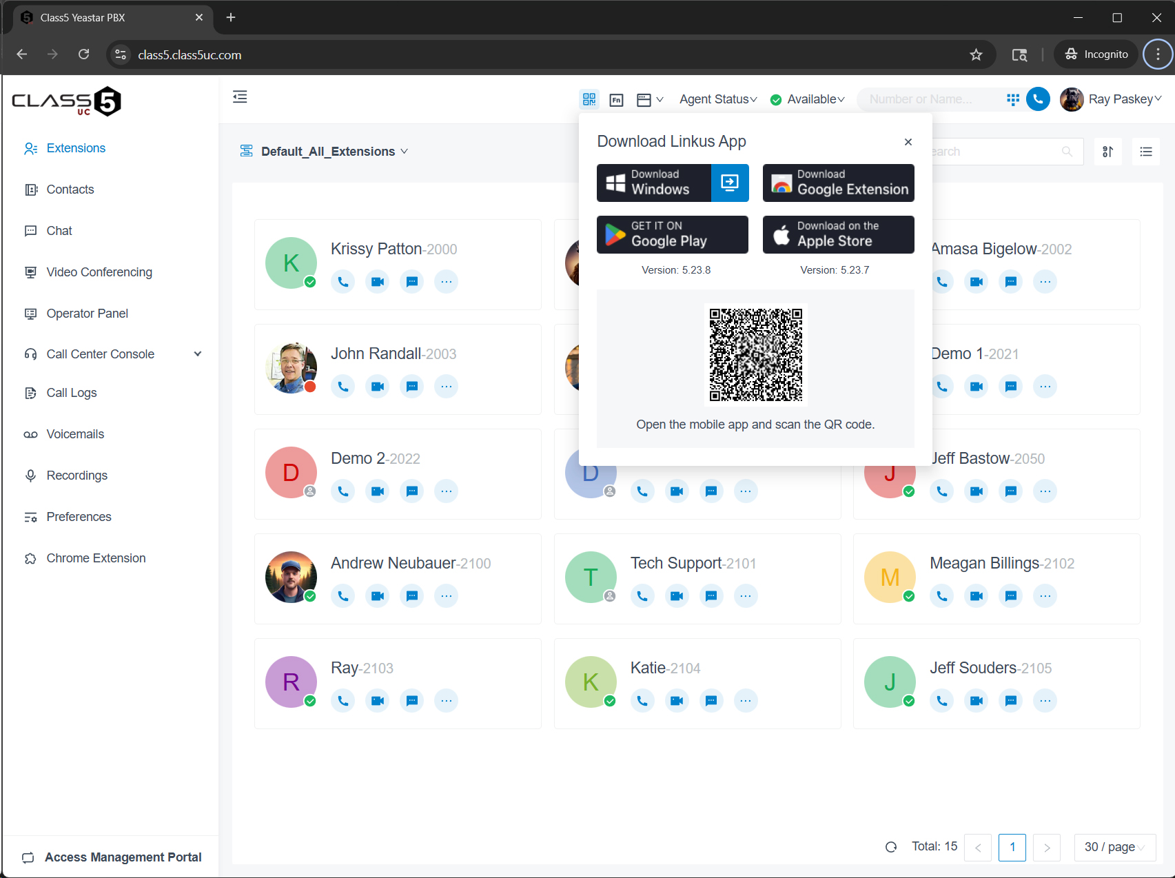 Loading and logging into your cell phone app is quick and easy. Once logged into your Collaboration website click on the icon with 4 small squares with a blue tinge. That will drop a window down with a QR code unique to your extension.