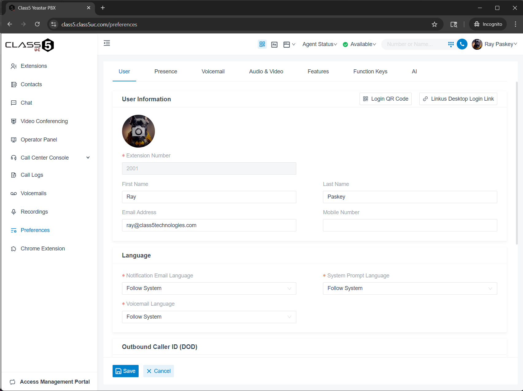 There are several tabs where you can make changes to match your personal needs. You can upload an image to represent yourself within the phone system to others, update your name and email address, change your password, edit your Presence settings, etc.