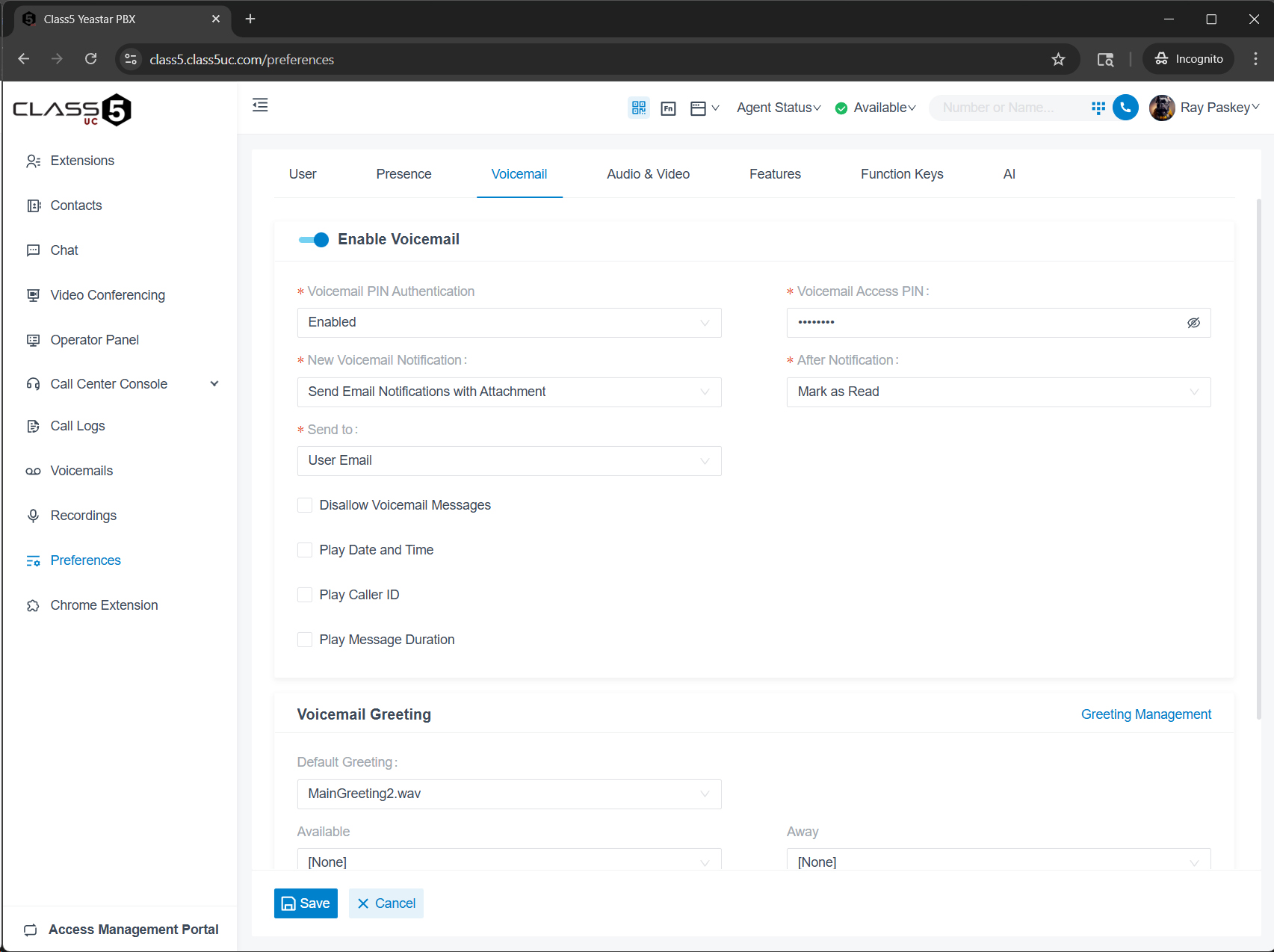 Here you can change your PIN for logging in remotely or from a desk phone, you can turn on or off voicemail to email notifications, make changes to how you hear your voicemails (Play date, caller ID)
